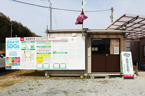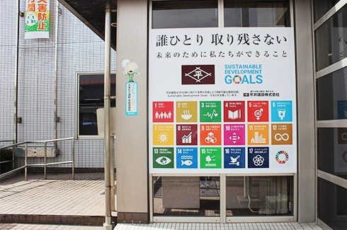 本社屋内外と現場事務所にてSDGs推進におけるPRとしてパネルを設置しております。