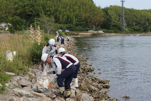 『泳げる中海をめざして!』水質悪化が問題となっている中海(安来市外)において、年3回行政機関並びに各種団体と共に沿岸の清掃活動(アダプトプログラム)に取り組み、さまざまなゴミを集積し泳げる中海を目指し継続的に取り組んで参ります。