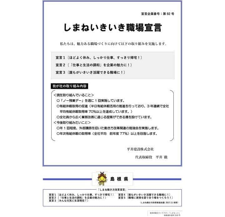 弊社は島根県より「仕事と家庭の調和」と「男女共同参画」の推進により、子育て中の従業員を積極的に支援、配慮する企業として、しまね子育て応援企業「こっころカンパニー」に認定されています。