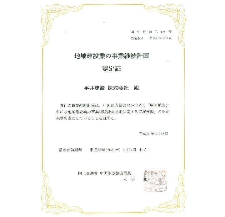 弊社では、緊急事態に備えて「事業継続計画(BCP=Business Continuity Plan)」を策定しています。企業においては、担当者が突然病気で欠勤した、機械設備が故障した、情報システムがストップした、資金繰りが苦しくなってきた、などといった緊急事態に対し常に備えなければいけません。このような状況を踏まえ、島根県では、企業における事業継続計画(BCP)策定を支援する事業を実施しており、弊社も認定を受けております。