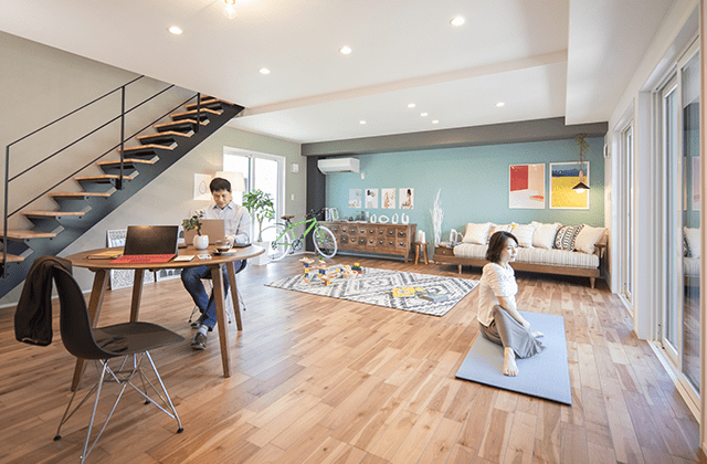 1階を大空間のLDKに。この空間を「LOUNGE」と名付けました。「LOUNGE」は使い方を自由に決められる空間。家族が同じことをして一緒に過ごすだけでなく、同じ空間を共有しながら、それぞれが思い思いのことをする。そんな使い方も。
