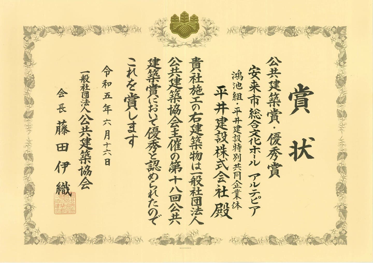 令和5年6月16日(金)第18回公共建築賞授与式が広島県広島市で開催され、安来市総合文化ホール アルテピア「文化施設部門」で公共建築賞・優秀賞を受賞しました。