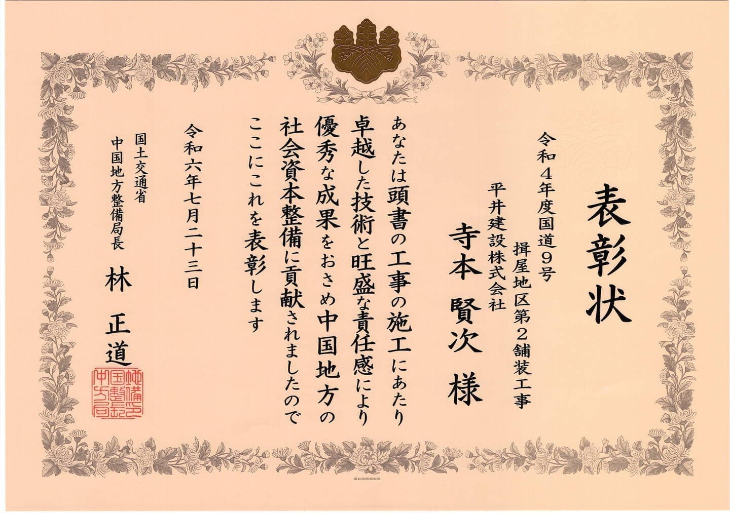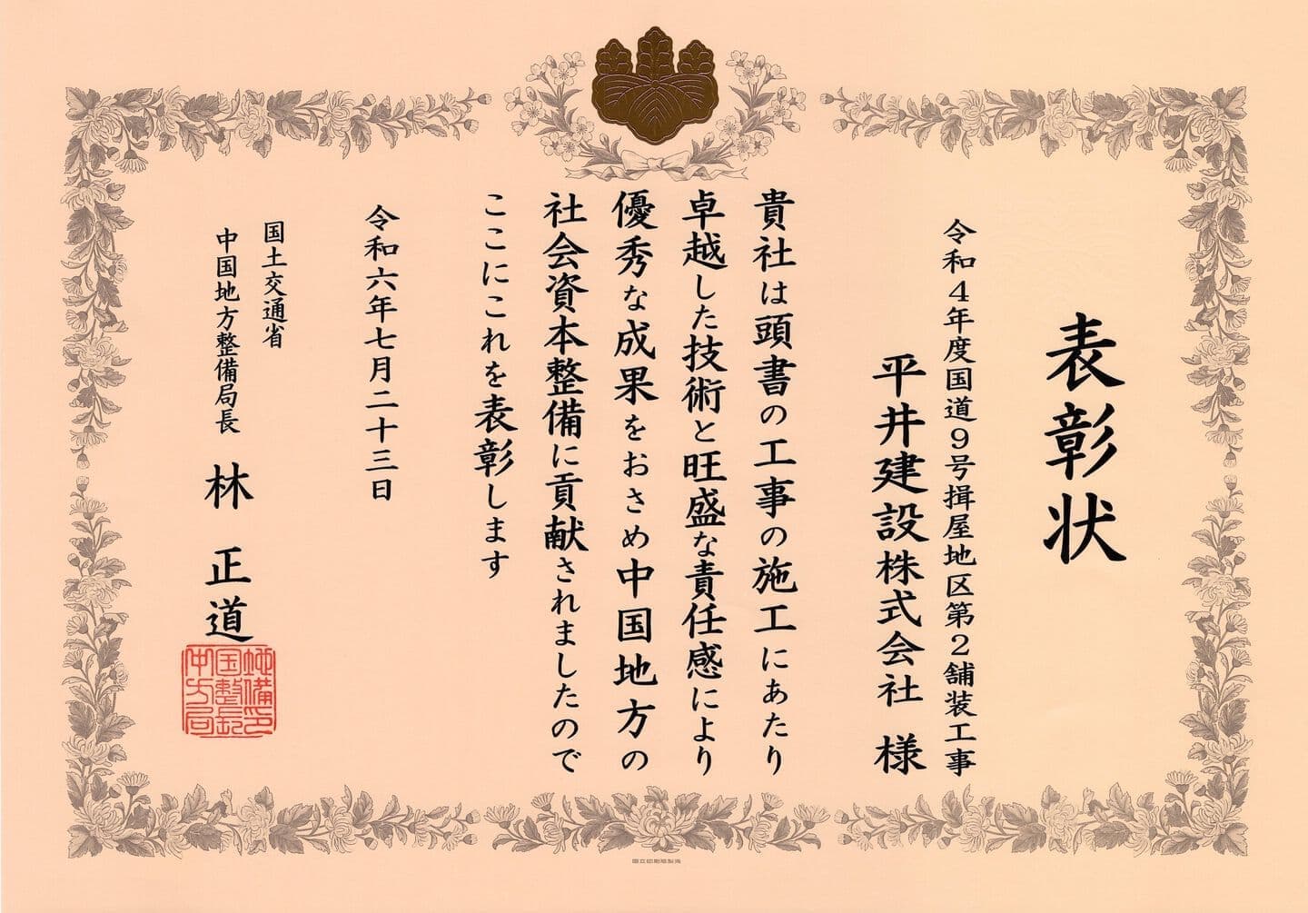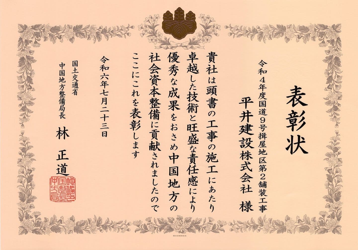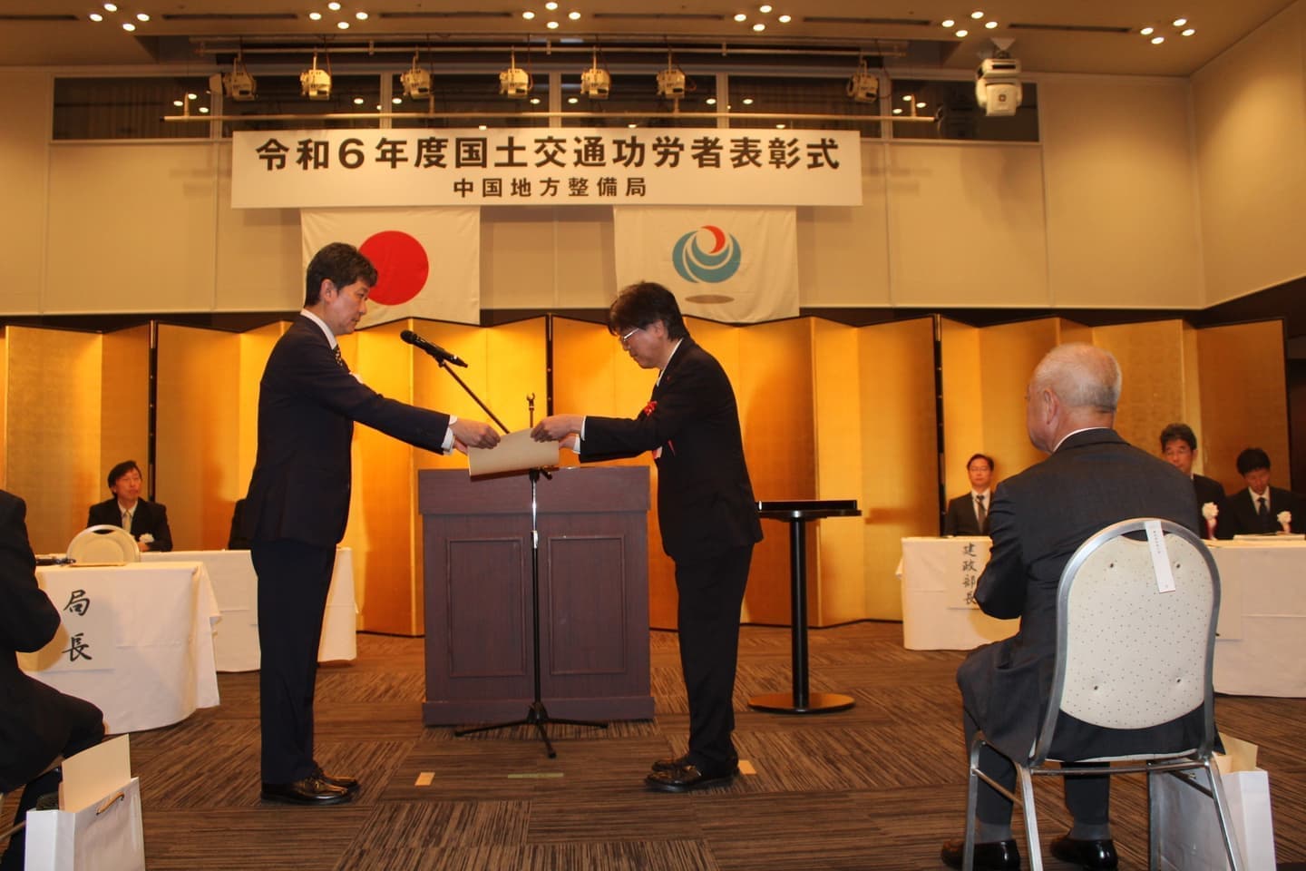 国土交通省中国地方整備局長より「優良工事施工団体表彰」「優秀建設技術者表彰(工事)」を受賞しました。