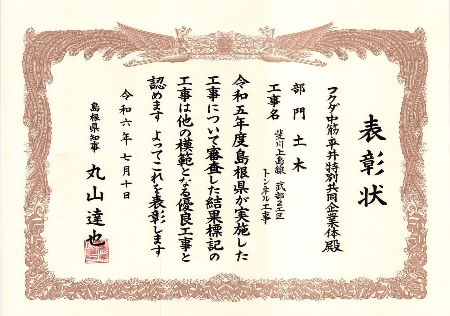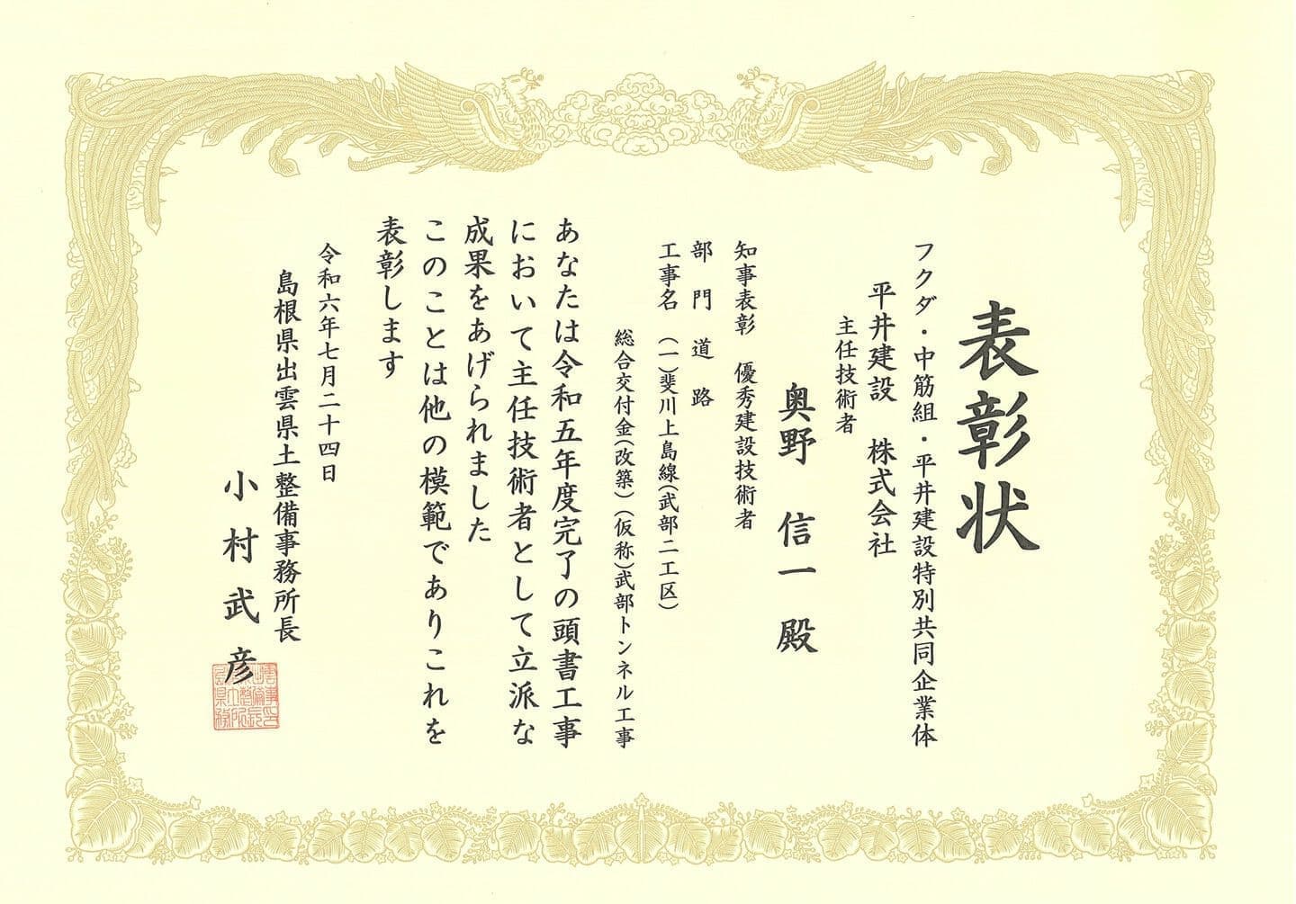 この度、令和6年度(令和5年度完了)島根県優良工事 知事表彰を受賞しました。