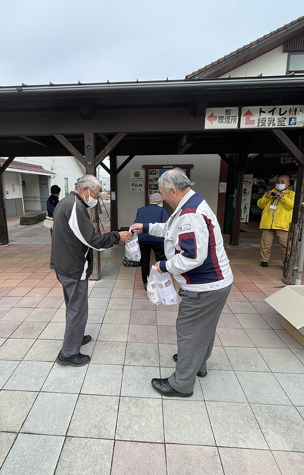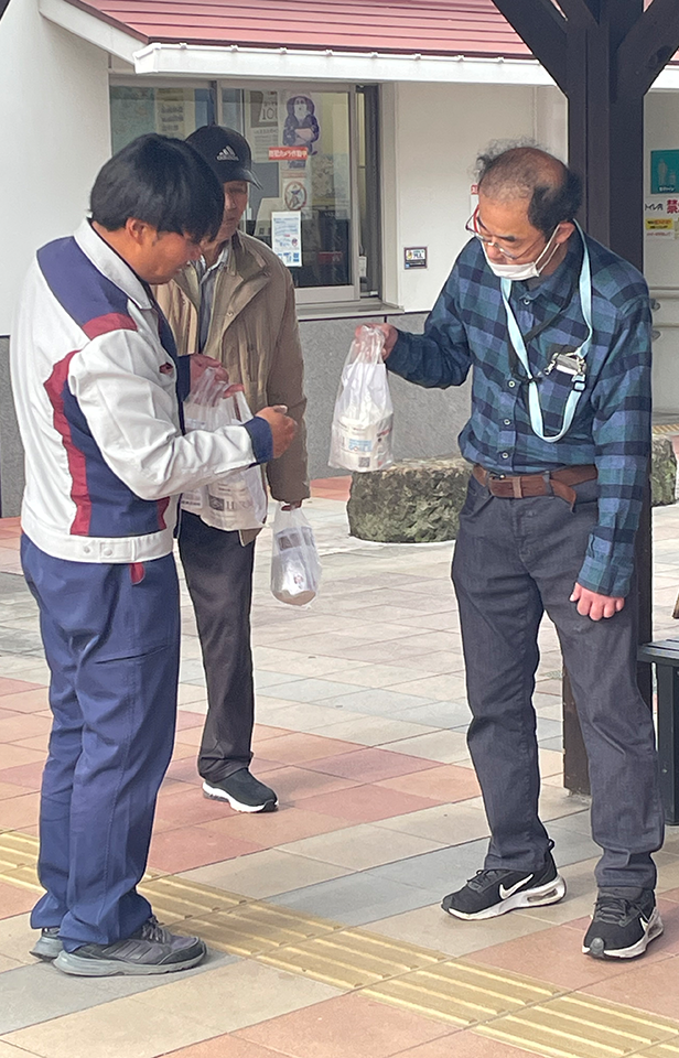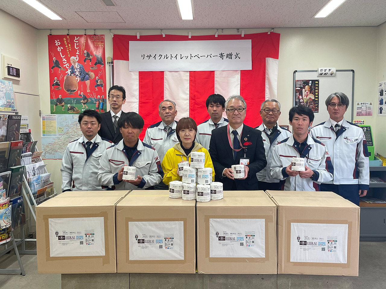 12月13日に、安来市中海町、道の駅あらエッサでリサイクルトイレットペーパーの寄贈式を行い、弊社のSDGs活動の一環として製作したトイレットペーパーを「中海ふれあい公園」と「道の駅あらエッサ」に寄贈いたしました。
