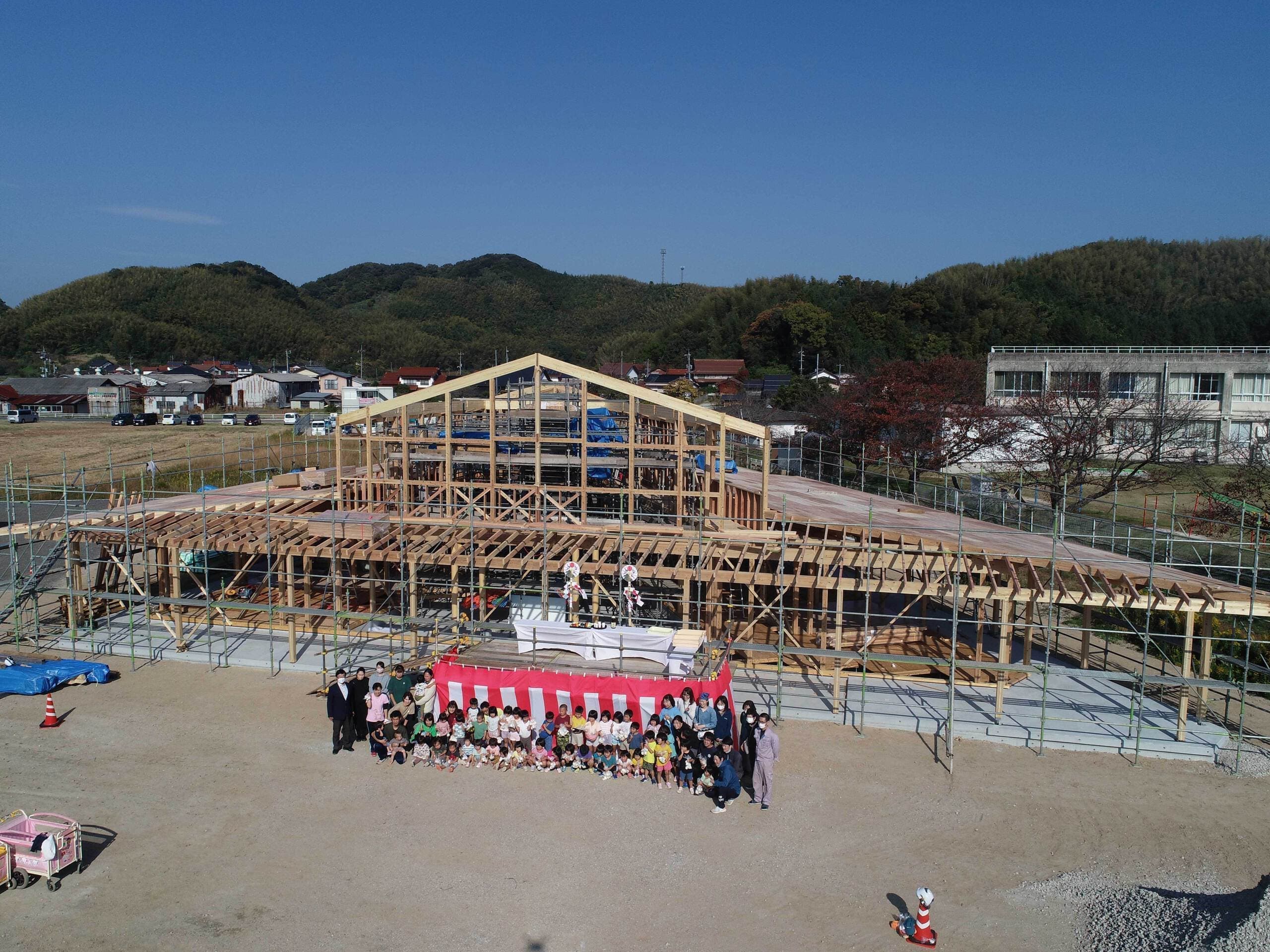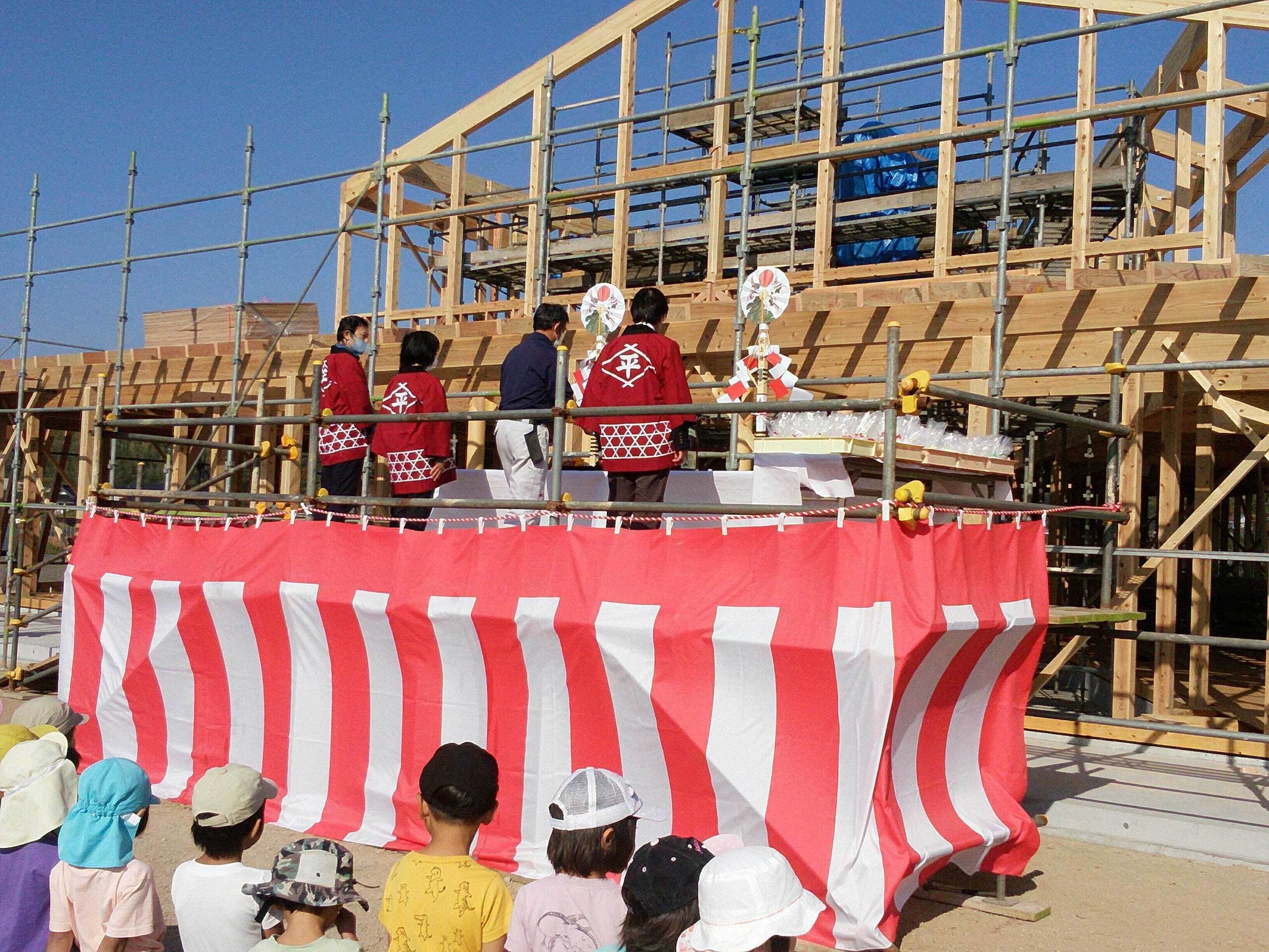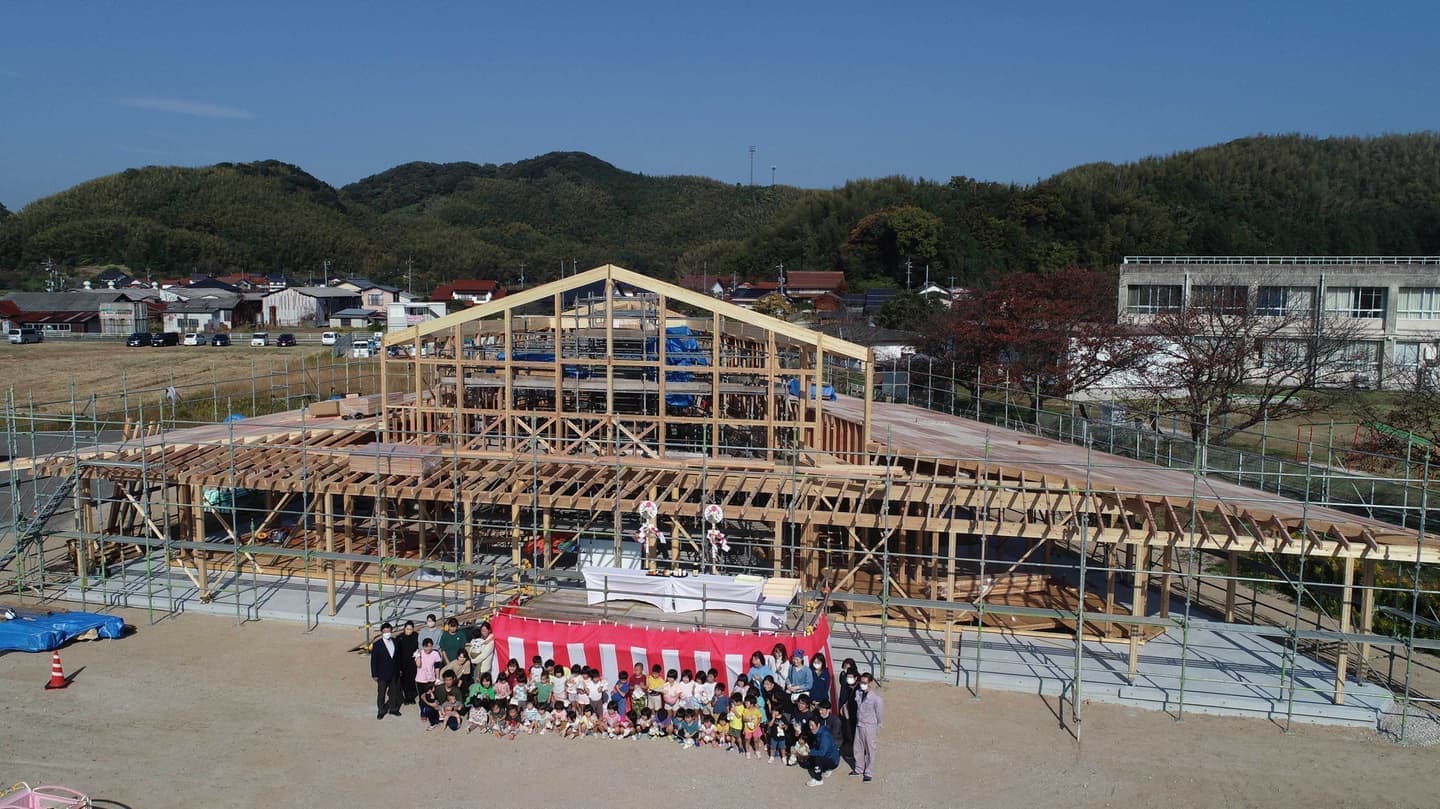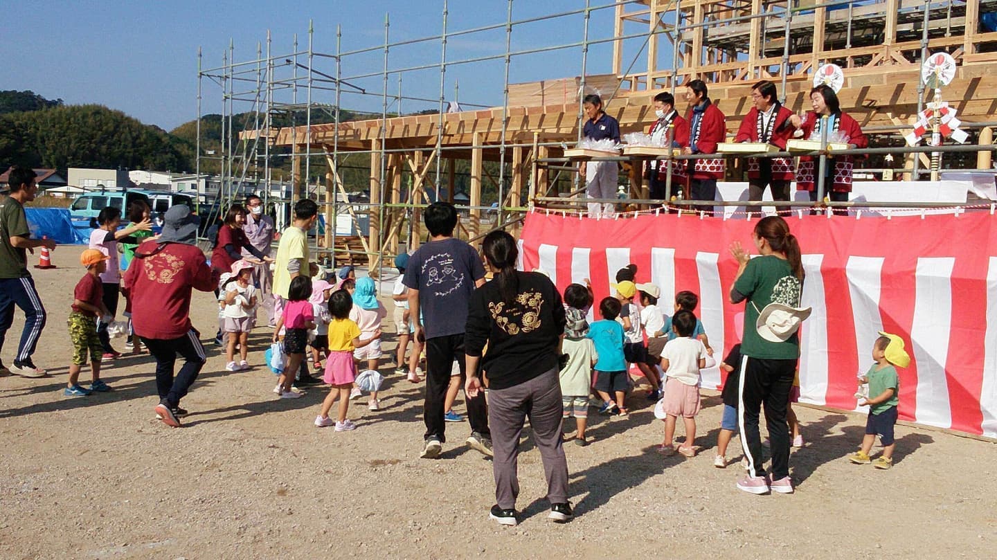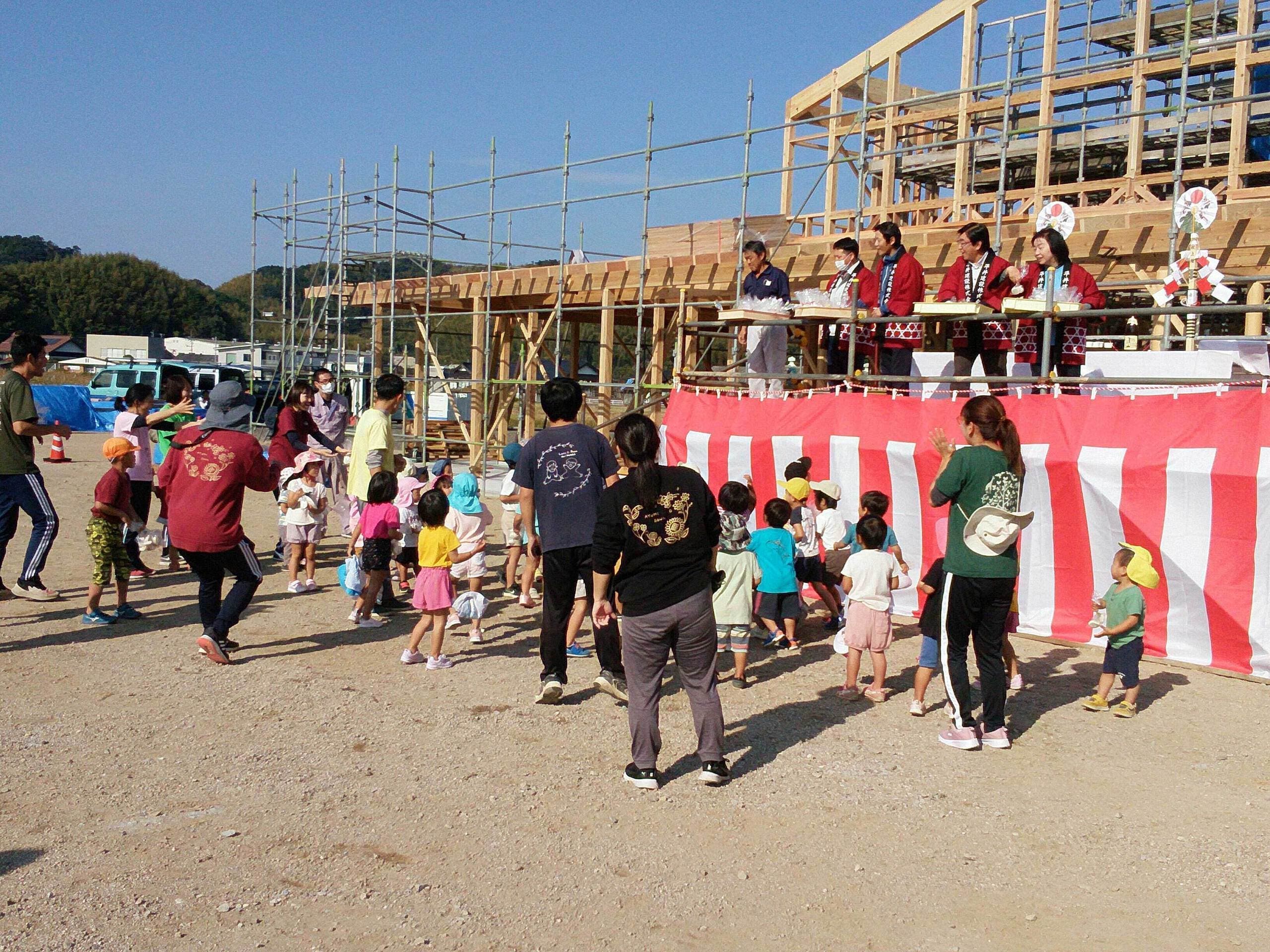 あゆみ保育園新園舎新築工事(本体工事)上棟式について 2022年11月10日 あゆみ保育園新園舎新築工事(本体工事)上棟式について 2022年11月10日 本日は、あゆみ保育園新園舎新築工事 上棟式をおこないました。天候にも恵まれ、園児たちはたくさんお餅を拾ってくれました。これから冬季に向かい厳しい作業環境に直面しますが、安全第一で無事に竣工できるよう工事を進めて参ります。