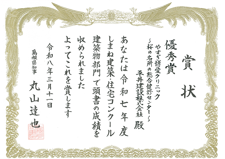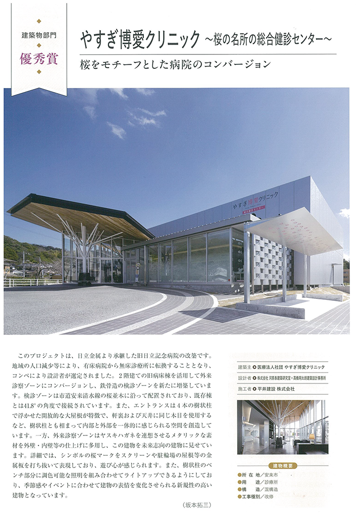 令和7年度しまね建築・住宅コンクールにて優秀賞を受賞しました。 2026年3月13日 この度、令和7年度しまね建築・住宅コンクールにて優秀賞(建築物部門)を受賞しました。 ★ 建築主 医療法人社団 やすぎ博愛クリニック ★ 設計者 株式会社 河原泰建築研究室+高橋翔太朗建築設計事務所 ★ 施工者 平井建設株式会社 ★ 所在地 島根県安来市 ★ 用途 診療所 ★ 構造 混構造 ★ 工事種別 改修 しまね建築・住宅コンクール ※上の画像はクリックすると拡大表示されます しまね建築・住宅コンクール□島根県https://www.pref.shimane.lg.jp/kenchikujuutaku/shimanenosumai/konku-ru/ 詳しくはこちら