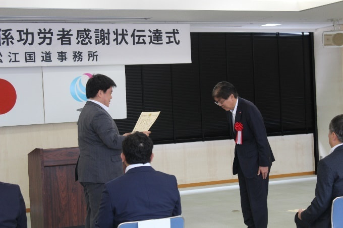 災害対策関係功労者感謝状伝達式にて、感謝状を受贈しました 2025年6月24日 この度、中国地方整備局より「災害対策関係功労者」として、感謝状を受贈しました。 ※上2枚の画像はクリックすると拡大表示されます 詳しくはこちら