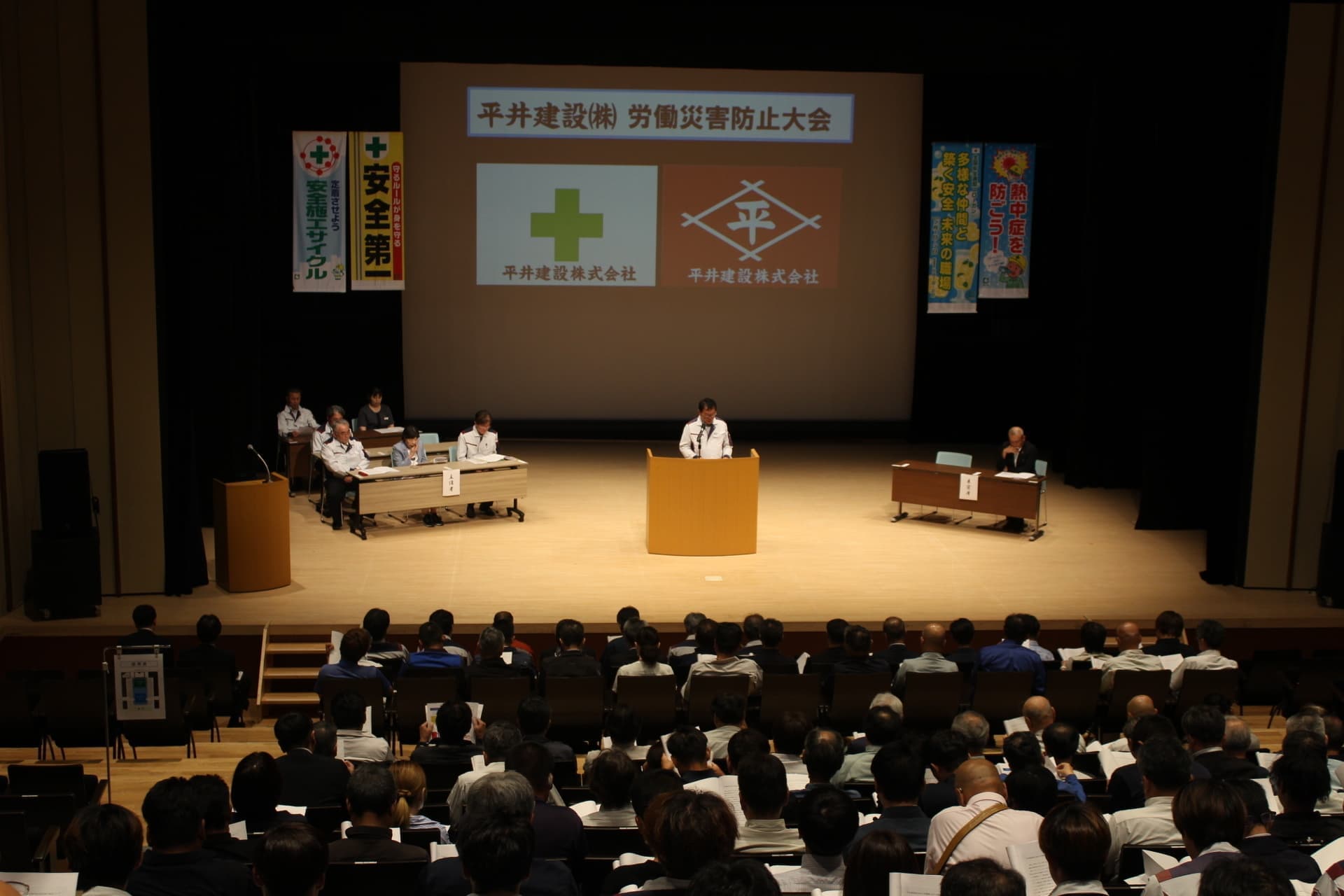 労働災害防止大会を開催しました 2025年6月30日 6月27日(金)安来市総合文化ホールアルテピアにて、平井建設(株)労働災害防止大会を開催しました。従業員をはじめ多くの協力業者様にも参加していただきました。 平井建設(株)の今年度年間目標は「安全衛生管理レベル向上を推進し、ゼロ災達成を目指す。」です。 この大会を契機に、皆で安全意識の共有・向上させ、1年間の無事故無災害を目指していきます。 ※上2枚の画像はクリックすると拡大表示されます