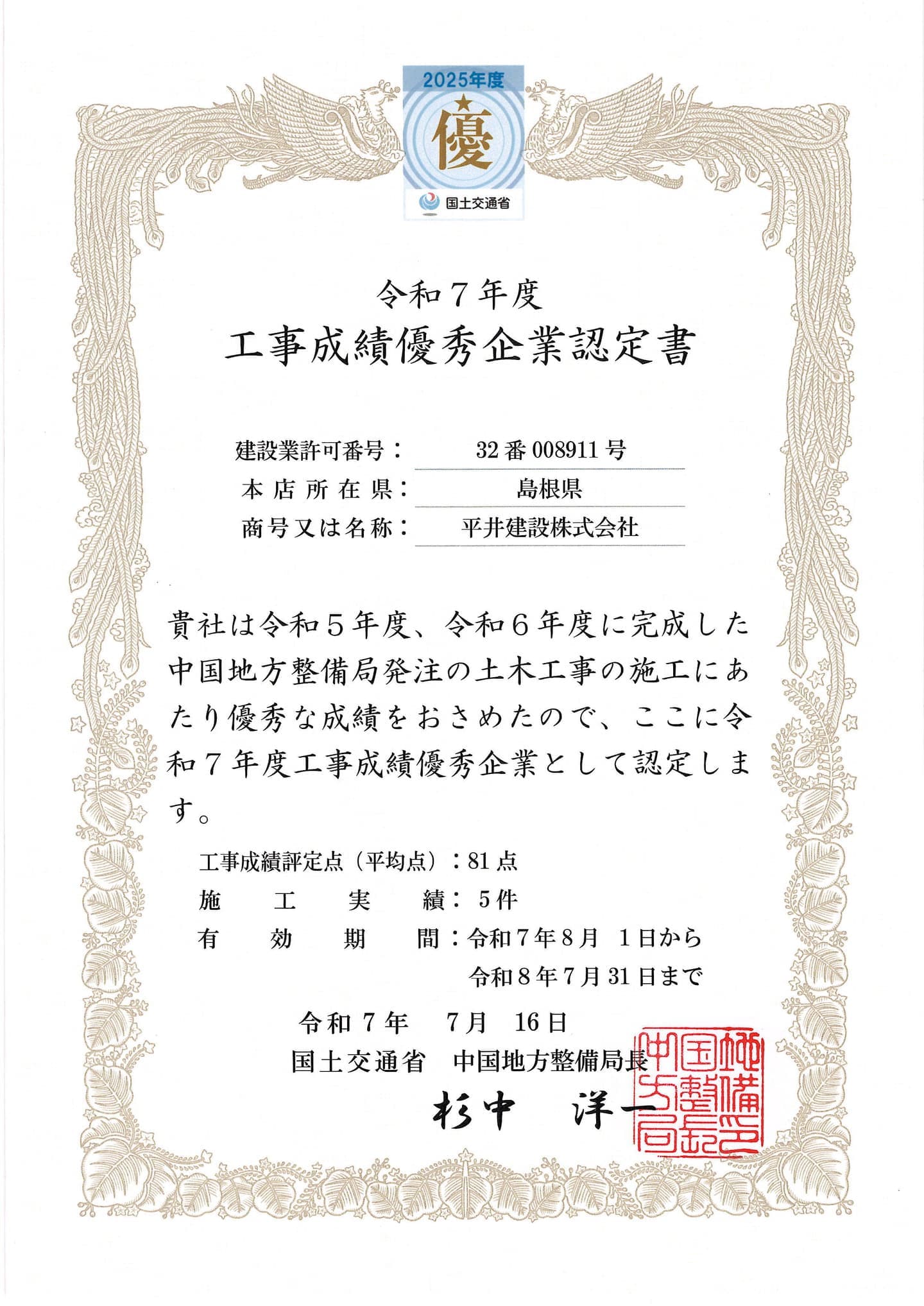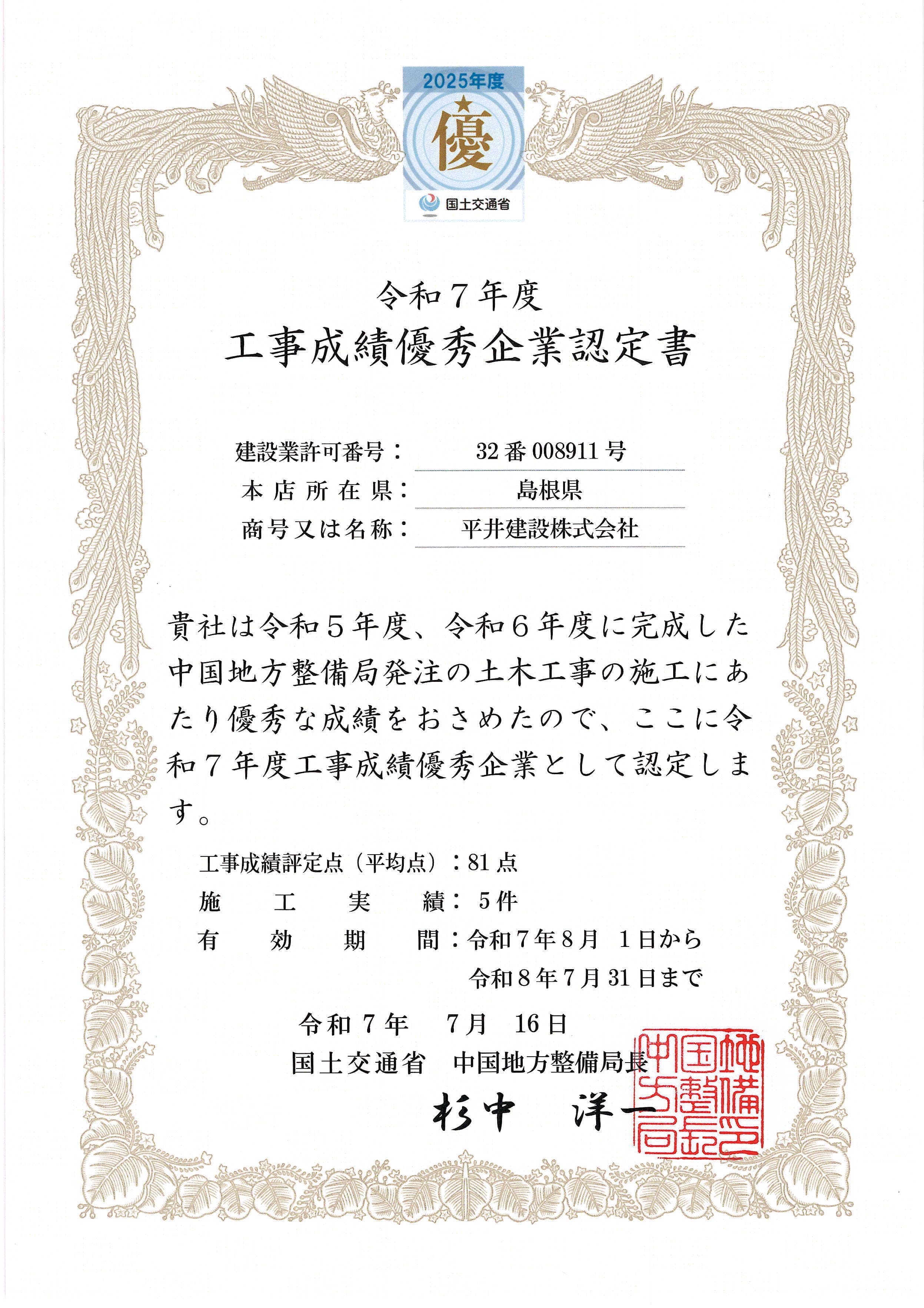 弊社は、国土交通省中国地方整備局より令和7年7月16日付で「令和7年度工事成績優秀企業」として認定されました。