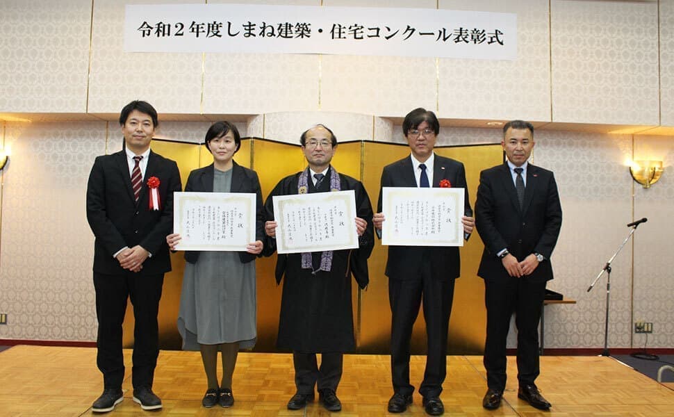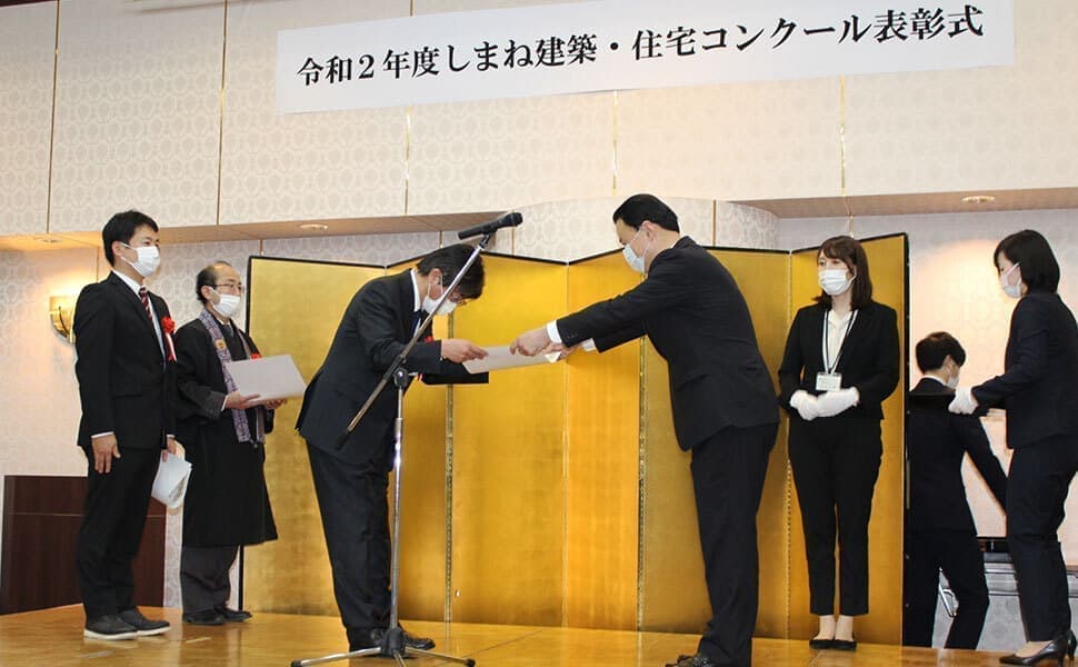 令和3年3月9日(火)令和2年度しまね建築・住宅コンクールの受賞式がサンラポーむらくもで開催され、島根県知知事 丸山達也様より『奨励賞』を受賞しました。